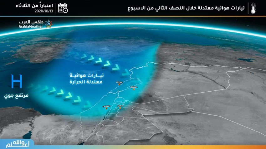 يمتد مرتفع جوي (منطقة ضغط جوي مرتفع) من شرق البحر الأبيض المتوسط باتجاه شمال مصر ومنطقة بلاد الشام يوم الأربعاء، تهب على إثره رياح غربية ذات درجات حرارة معتدلة ورطبة، تعمل على جعل الأجواء خريفية معتدلة مجددا في عموم مناطق المملكة، كما تعود درجات الحرارة لتصبح حول معدلاتها السنوية نهاية الأسبوع