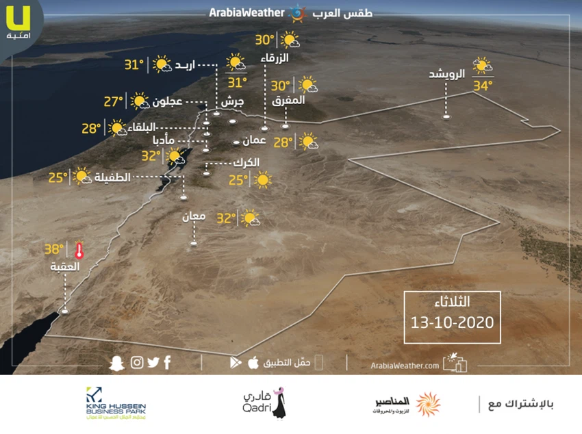 درجة الحرارة العظمى المتوقعة في الكرك: °25
