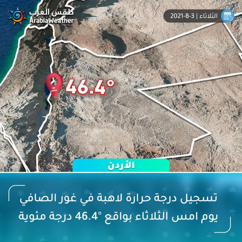 طقس العرب - مع تأثر المملكة بكتلة هوائية حارة سَجلت محطة غور الصافي يوم أمس الثلاثاء درجة حرارة العظمى قيماً عالية بواقع °46.4 درجة مئوية بحسب منظمة الأرصاد العالمية المسؤولة عن تجميع درجات الحرارة المُسجلة لغاية التوثيق.