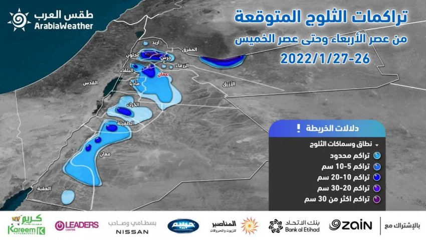 يُتوقع بمشيئة الله ان تبدأ المرتفعات الجبلية التي يزيد ارتفاعها عن 1000 متر تستقبل الثلوج عصر الأربعاء وتمتد الثلوج تدريجيًا بحلول المساء لتصل إلى مرتفعات 800 متر فوق مستوى سطح البحر وتكون الثلوج مُتراكمة بشكلٍ مُتسارع مع مرور الوقت وتشمل مناطق عديدة من المملكة بما فيها أجزاء مُختلفة من العاصمة عمان والمدن الرئيسية ولا يُستبعد ان تكون الثلوج رعدية احياناً، كما وتهطل الأمطار الغزيرة على مناطق دون ذلك الارتفاع، يصاحبها تساقط زخات كثيفة من البَرَد أحياناً.