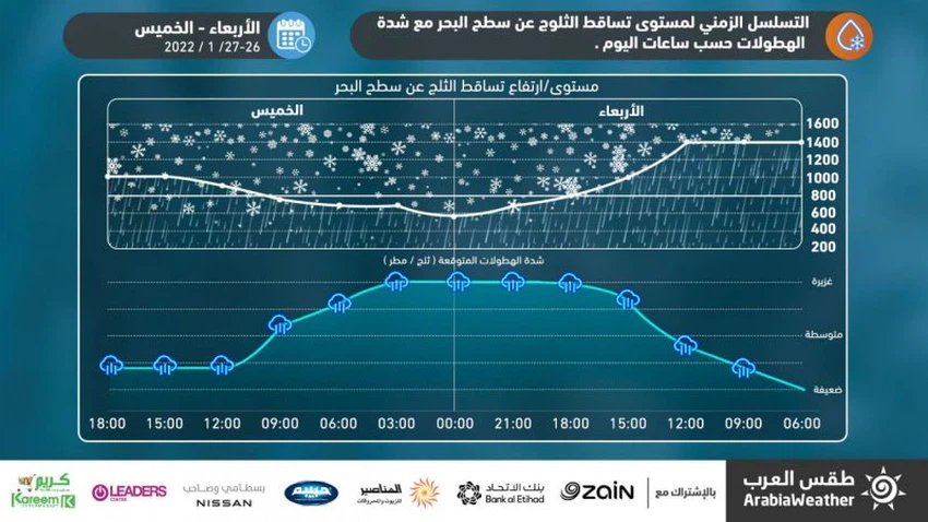 هذا ويُتوقع كادر التنبؤات أن يستمر تساقط الثلوج فوق المرتفعات الجبلية التي يزيد ارتفاعها عن 800 متر ليل الأربعاء/الخميس في شمال ووسط مناطق المملكة تكون على شكل امطار وزخات كثيفة من البَرَد فوق المناطق الأقل ارتفاعاً، بينما تتراجع الهطولات عن المناطق الجنوبية.