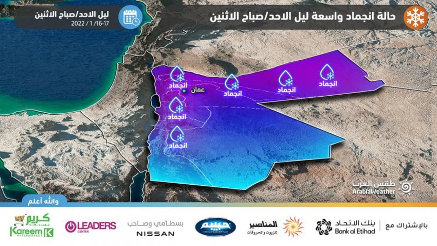 طقس العرب - تشير آخر مُخرجات النماذج الجوية العددية المُعالجة لدى قسم العمليات الجوية في مركز طقس العرب الإقليمي إلى حدوث تقلبات جوية هامة على الأردن الأيام القادمة مُتمثلة بتأثر المملكة بمُنخفض جوي جديد مصنف من الدرجة الثالثة (متوسط إلى عالي الفعالية) مع عبور جبهة هوائية باردة الأحد تندفع خلفها كتلة هوائية سيبيرية قطبية شديدة البرودة تتمركز فوق العراق وذلك إعتباراً من الأحد ولعدة أيام وسطَ توقعات بتساقط الثلوج في مناطق نادراً ماتشهد ثلوج يليلها موجة واسعة من الجليد.التفاصيل