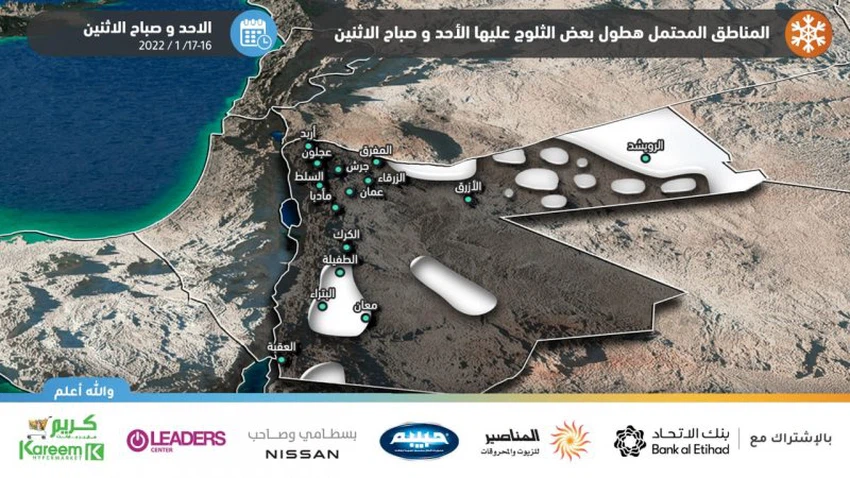 ويُتوقع بمشيئة الله ان يتزامن عبور الجبهة الهوائية الباردة مع بدء انسياب رياح شمالية قطبية شديدة البرودة إلى مناطق البادية الشرقية مما يتسبب بإحداث تساقطات ثلجية نادرة ومُتراكمة على البادية الشرقية (الرويشد، الصفاوي، الطريق الدولي الواصل مع بغداد، الحدود الأردنية/العراقية، الدفيانة و إم القطين).