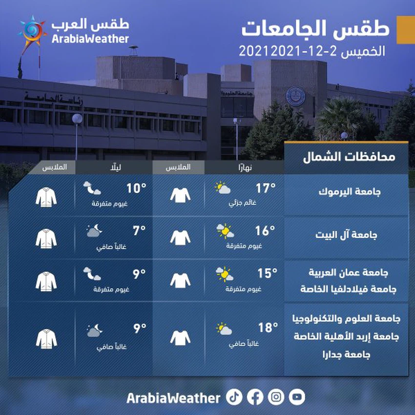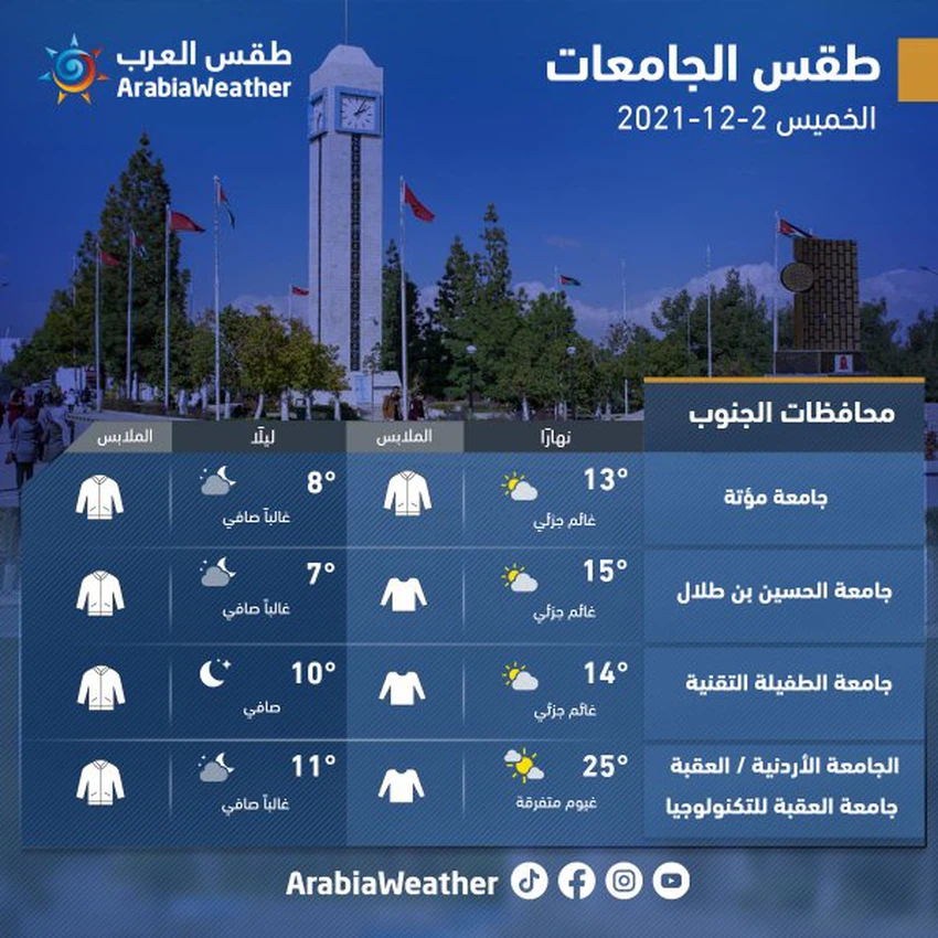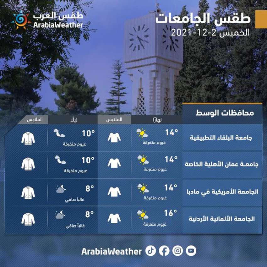 وفيما يلي توقعات الطقس وتوصيات الملابس لطلبة الجامعات الأردنية: