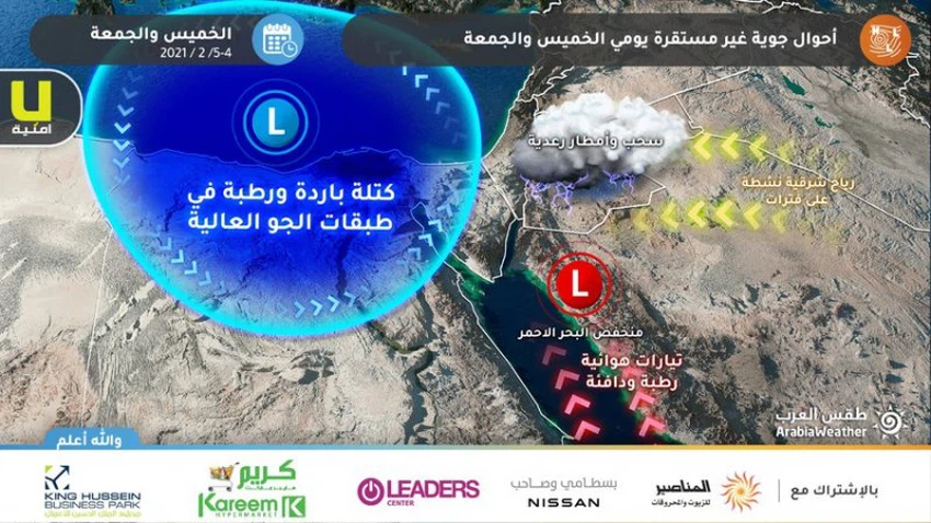 طقس العرب - بحسب اخر مخرجات النماذج الجويه العدديه توقع ان تبدأ المملكة تتأثر بحالة شاملة من عدم الاستقرار الجوي خلال ساعات ليلة الاربعاء/الخميس خاصة المتأخرة منها،مما يتسبب بنشوء السُحب الرعدية وهطول الأمطار في اقصى جنوب المملكة تحديداً مدينة العقبة، مع انتشار السُحب الرعدية تدريجيًا في جنوب المملكة خلال ساعات فجر وصباح الخميس، ويُتوقع ان تكون الامطار مُتفاوتة الشدة حسب المنطقة، إلا انها ستكون غزيرة في بعض المناطق بما فيها العقبة ومصحوبة بنشاط الرياح وتساقط البرَد، مما يؤدي إلى تشكل السيول وارتفاع منسوب المياه.