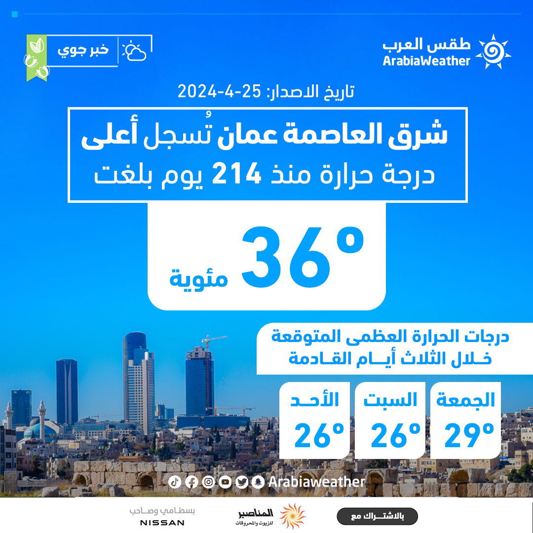 طقس العرب - بلغت درجة الحرارة العظمى نهار اليوم الخميس 25-4-2024 في العاصمة عمّان 36° درجة مئوية، وسُجلت في مطار عمان المدني، بزيادة عن معدلها لمثل هذا الوقت من العام بمقدار 12 درجة مئوية، حيث أن اليوم هو ذروة تأثير الكتلة الهوائية الحارة التي تؤثر على المملكة، وهذه الحرارة لم تسجل منذ 214 يوم، وتحديداً منذ شهر أيلول الماضي بتاريخ 23-9-2023، حيث بلغت حينها درجة الحرارة العظمى في العاصمة عمان 37 درجة مئوية.