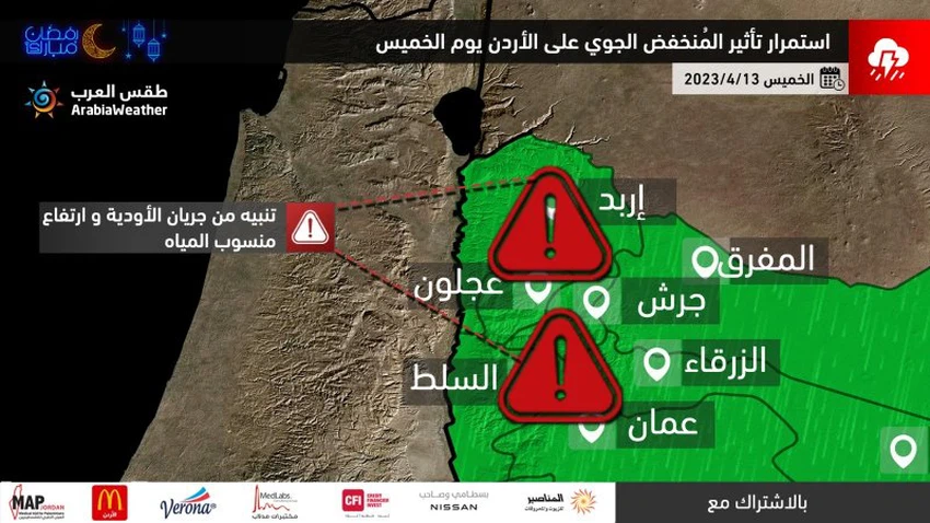 طقس العرب - بحسب أحدث القراءات و الرصدات الجوية الواردة إلى مركز طقس العرب، يُتوقع استمرار تأثر المملكة الأردنية نهار الخميس بالمُنخفض الجوي المُصنف بالدرجة الثالثة (مُتوسط إلى عالي الفعالية) و الذي يتميز ببطء حركته و يُعتبر مُنخفضاً ماطراً بإمتياز.
