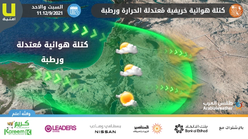 يُتوقع بمشيئة الله ان تندفع نحو المملكة إعتباراً من يوم السبت كتلة هوائية خريفية مُعتدلة الحرارة ورطبة قادمة من شرق البحر المتوسط نحو المنطقة، بحيث يطرأ انخفاض واضح على درجات الحرارة لتكون اقل من مُعدلاتها ويتعمق تاثير الكتلة الهوائية المُعتدلة يوم الاحد ويطرأ المزيد من الانخفاض على درجات الحرارة، بحيث يتحول الطقس يومي السبت والأحد ليُصبح مُعتدلاً فوق عموم مناطق المملكة، حاراً نسبياً في الأغوار والبحر الميت ومدينة العقبة بالإضافة إلى اجزاء من البادية.