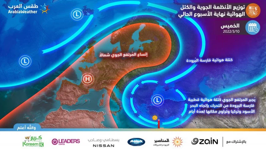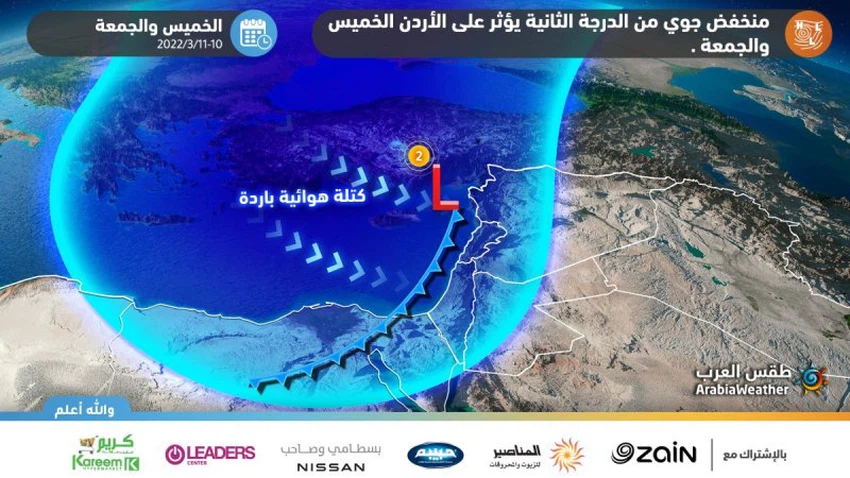 وفي التفاصيل، يُتوقع أن يتعمق المُرتفع الجوي على أجزاء واسعة من غرب وأواسط القارة الأوروبية وأن يتسع شمالاً ليصل إلى الدول الاسكندنافية ويتزامن ذلك مع اندفاع كتلة هوائية قطبية وشديدة البرودة يدفع بها المُرتفع الجوي لتهوي إلى شرق وجنوب شرق أوروبا وحوض البلقان وذلك يوم الخميس 10-03-2022. ويتشكل على إثر ذلك مُنخفض جوي في المنطقة الشرقية للبحر الأبيض المُتوسط يؤثر على الأردن يوم الجمعة كمُنخفض مُصنف بأنه من الدرجة الثانية وفقاً لمؤشر قياس شدة المنخفضات الجوية، وقال كادر التنبؤات الجوية أن هذا المُنخفض الجوي تحت المراقبة لدى مركز عمليات طقس العرب نظراً لقابليته للتطور تِباعاً في الساعات القادمة.