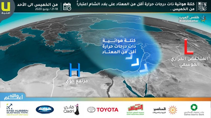 طقس العرب - تنخفض درجات الحرارة بشكل ملموس اعتبارا من الخميس في العديد من مناطق المملكة؛ بسبب بداية تأثير كتلة هوائية ذات درجات حرارة أقل من المعتاد على شرق البحر المتوسط والمملكة، مع توقعات بأن يستمر تأثير الكتلة الهوائية المعتدلة خلال عطلة نهاية الأسبوع.