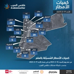 طقس العرب - تأثرت المملكة الأردنية يومي السبت والأحد بمنخفض جوي مُصنف من الدرجة الثالثة بحسب مقياس شدة المنخفضات الجوية لدى طقس العرب، وهطلت على إثره الأمطار الوفيرة في مختلف مناطق ومحافظات المملكة بشدد وغزارة متفاوتة وعلى فترات