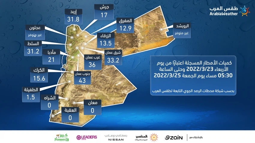 وتاليًا كميات الأمطار المُسجلة بحسب شبكة محطات طقس العرب اعتبارًا من يوم الأربعاء وحتى الساعة 5:30 مساء اليوم الجمعة 25/3/2022