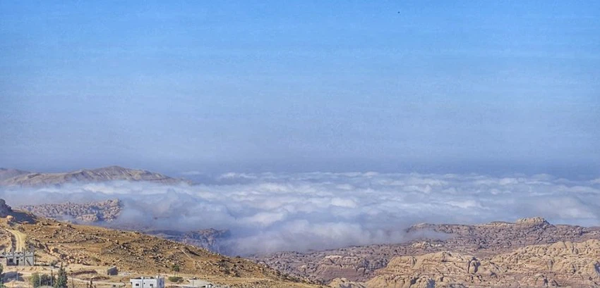 صورة تمثل ظاهرة ضباب الوادي كما رصدها مندوب طقس العرب ابراهيم خليفات في منطقة وادي موسى جنوب الأردن
