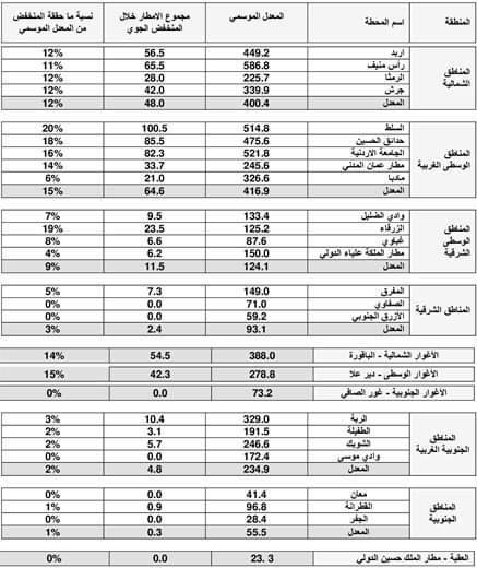 كما سجلت محطة رصد راس منيف/محافظة عجلون اعلى مجموع مطري في المناطق الشمالية وبمجوع مطري بلغ (65.5) ملم محققاً ما نسبته 11% من معدلها الموسمي العام، يليها محطة رصد اربد بمجموع مطري بلغ (56.5) ملم محققاً ما نسبته 12% من معدلها الموسمي العام، يليها في محطة رصد الباقورة /الاغوار الشمالية وبمجموع مطري بلغ (54.5) محققا ما نسبته 14% من معدلها الموسمي العام.