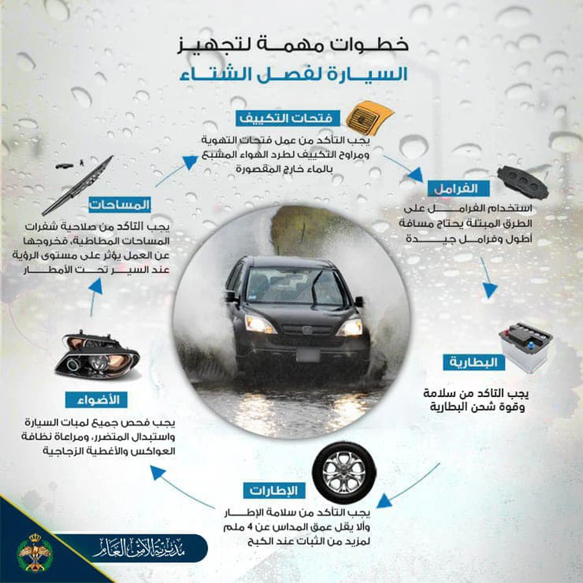 طقس العرب - تهيب مديرية الأمن العام بالأخوة المواطنين ضرورة أخذ الحيطة والحذر وانتهاج السلوك السليم خلال حالة عدم الاستقرار الجوي المتوقعة في اليومين القادمين