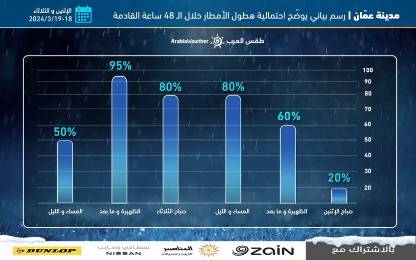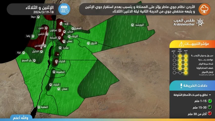 من مركز طقس العرب الإقليمي - تُشير أحدث الخرائط الجوية إلى أن الأردن ستتأثر بمشيئة الله بمُنخفض جوي مُصنف من الدرجة الثانية (و هي الدرجة التي تعني بأنه اعتيادي) وفق مقياس شدة المُنخفضات الجوية و يبدأ تأثيراته على المملكة اعتباراً من الليلة و يستمر تأثيره على المملكة لنحو 24 ساعة بمشيئة الله.