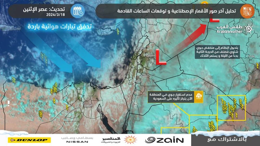 و بحسب المُحاكاة الحاسوبية في مركز طقس العرب، فإنه يُتوقع تدريجياً مع مُرور ساعات هذه الليلة أن تتأثر المملكة بالمنخفض الجوي و الذي سيتمركز حينها شرق الأراضي السورية، بحيث يطرأ انخفاض إضافي على درجات الحرارة و يتحول الطقس ليُصبح بارداً و غائماً و ماطراً في العديد من المناطق خاصة الشمال و الوسط و قد يصحبها حدوث الرعد أحياناً و تساقط البَرَد.