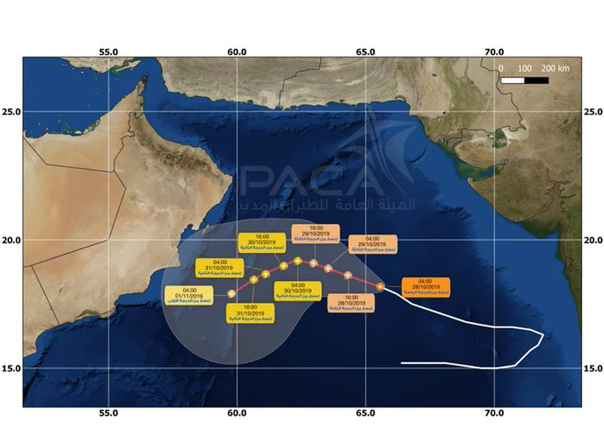 طقس العرب - نشرت الهيئة العامة للأرصاد الجوية في سلطنة عُمان عبر حسابها في تويتر خريطة توضح المسار الذي يتوقع ان يسلكه اعصار كيار المتواجد حالياً في بحر العرب، والذي لازال يُصنف ضمن الدرجة الرابعة على سلم الاعاصير.