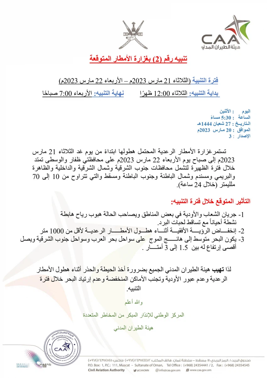 طقس العرب - أصدرت الأرصاد العُمانية وهيئة الطيران المدني التنبيه الثاني بغزارة الأمطار المُتوقعة خلال يومي الثلاثاء والأربعاء 21 و 22 مارس 2023 ، ويُفيد التنبيه بالتالي: