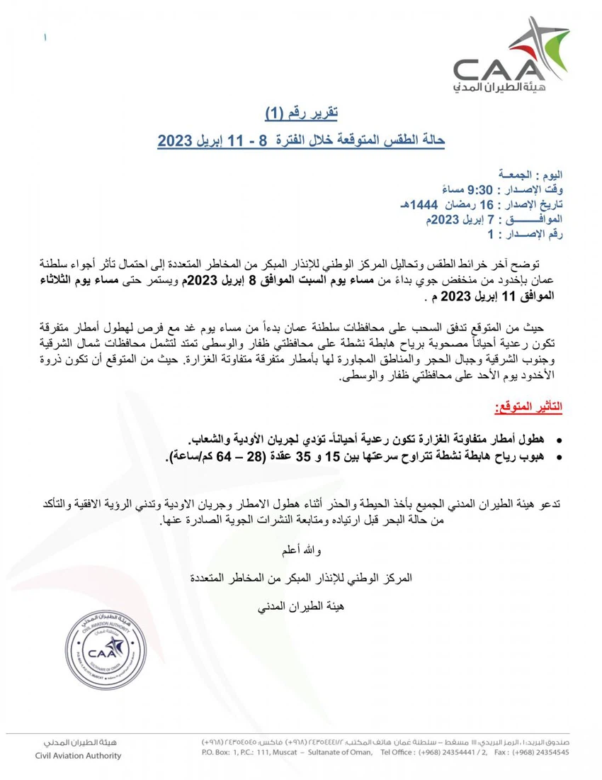 طقس العرب - أصدرت الأرصاد العُمانية تقريرها الأول حول الحالة الجوية المُتوقعة خلال الفترة من 8 إلى 11 ابريل 2023 ، حيث تُوضح آخر خرائط الطقس وتحاليل المركز الوطني للإنذار المُبكر من المخاطر المُتعددة إلى احتمال تأثر أجواء سلطنة عُمان بأخدود من منخفض جوي بدءًا من مساء يوم السبت الموافق 8 ابريل 2023م ويستمر حتى مساء يوم الثلاثاء الموافق 11 ابريل 2023م