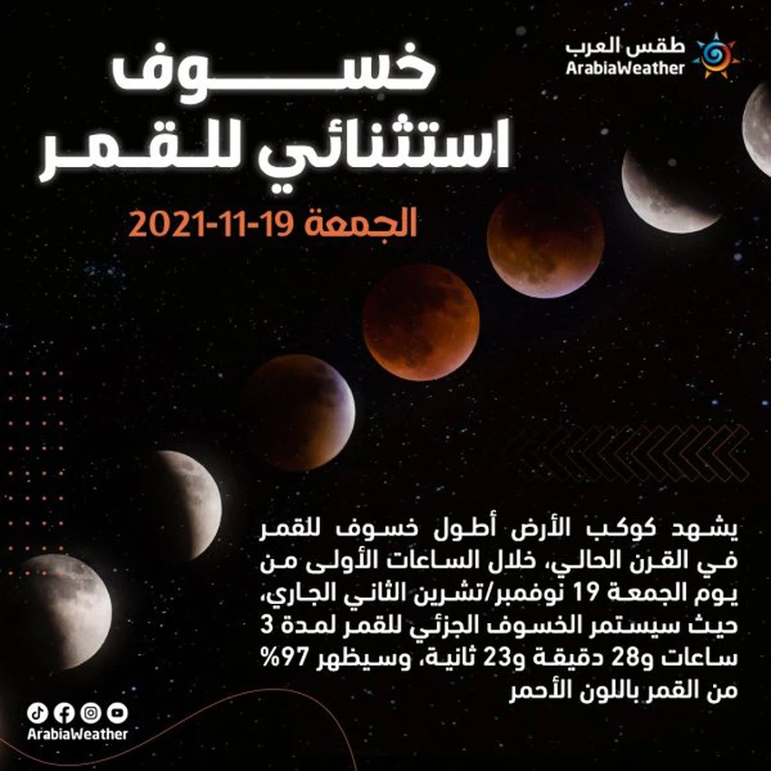 طقس العرب - أعلنت وكالة الفضاء الأمريكية "ناسا" أن العالم سيشهد خسوفا جزئيا مميزا للقمر في ليلة (18 - 19) نوفمبر الجاري، وسيكون الأطول خلال القرن الـ21، بحيث يستمر لمدة 3 ساعات و 28 دقيقة و23 ثانية، وسيظهر خلالها 97% من القمر باللون الأحمر.