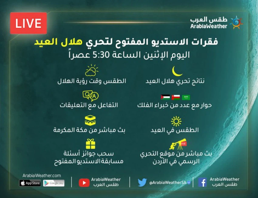 طقس العرب- يخصص طقس العرب اليوم الاثنين ساعتان من البث المباشر لنتائج تحري هلال شهر شوال 1440 وبشكل حصري، عبر برنامج "الاستوديو المفتوح"، يُقدمه أسامة الطريفي.