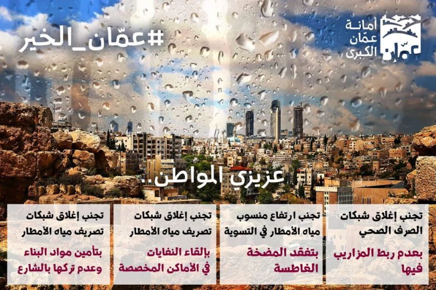 ودعت أمانة عمان المواطنين إلى عدم ربط مزاريب مياه الأمطار على شبكات الصرف الصحي، والتأكد من جاهزية المضخات الغاطسة بالتساوي مع توجيه دعوة بعدم استغلال طوابق الخدمات بالتساوي للسكن.