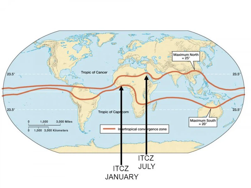 وفي الجزء المُقابل ونتيجة لتقابل الرياح التجارية من نصفي الكرة الشمالي والجنوبي يبدأ تأثير ما يُعرف بالخط المداري ITCZ على الأجزاء الجنوبية من القارة الأفريقية وأجزاء من الجزيرة العربية حيث تزداد قيم الحمل الحراري وتتشكل السحب الركامية وتهطل زخات رعدية في تلك المناطق ومع ارتفاع هذا الحزام خلال شهري يوليو وأغسطس ترتفع الهطولات المطرية في أجزاء من اليمن وجنوب السعودية وأجزاء من جنوب شرق سلطنة عُمان ووسط أفريقيا.