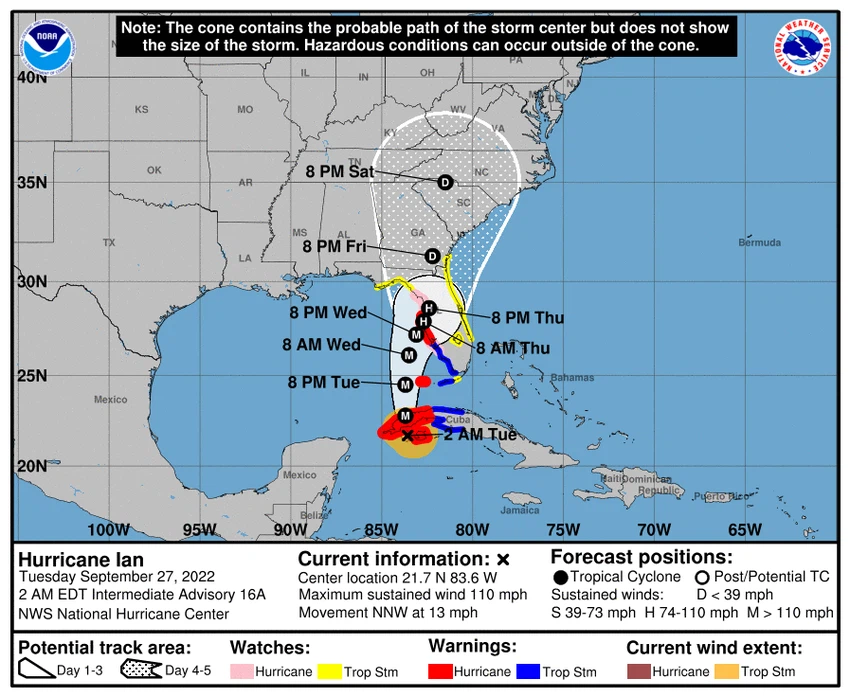 طقس العرب - ترصد صور الأقمار الإصطناعية لدينا في مركز طقس العرب الإعصار إيان من الدرجة الثالثة الذي بات يضرب كوبا بقوة مُترافق مع أمطار شديدة الغزارة ورياح عاتية تفوق ال185كم/ساعة مما يتسبب بهيجان أمواج البحر على المناطق والمُدن الساحلية مما يجعلها مُهددة بالغرق.