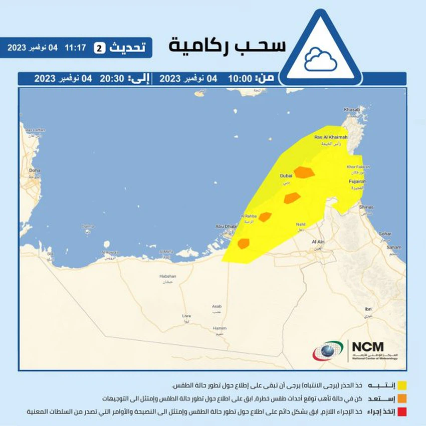 هذا و أصدر المركز الوطني للأرصاد تنبيهاً من احتمال تكون السُحب الركامية في مناطق عِدّة من شمال الدولة خلال الساعات القادمة.