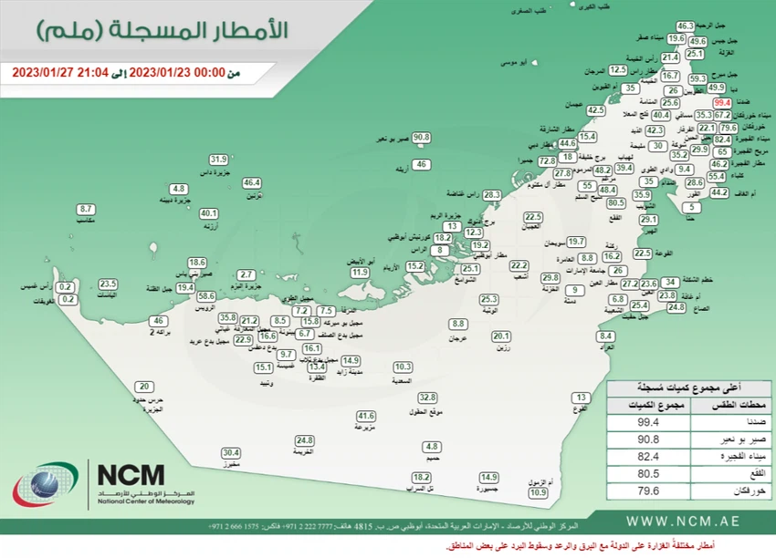 طقس العرب - تتعرض الإمارات مُنذ تاريخ 23/1/2023 لحالة من عدم الاستقرار الجوي ولازالت مُستمرة حتى اعداد هذا التقرير، ووفقاً لمحطات الرصد الجوي التابعة للمركز الوطني للأرصاد سَجلت مناطق مختلفة من الإمارات كميات جيدة من الأمطار بحمد الله، تُعطي دفعة ممتازة للموسم المطري في الدولة.