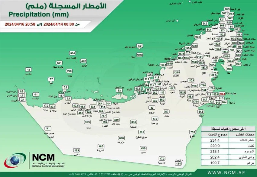 و تُظهر بيانات المركز الوطني للأرصاد بأن مُعظم مُدن الامارات قد سجلت كميات كبيرة من الأمطار، و قد وصلت أعلى كمية أمطار سجلت منذ الأحد، و حتى الليلة كانت على خطم الشكلة في مدينة العين، بأبوظبي، بواقع 234 ملم و هو ما يُعادل 234 مليون لتر في الكيلومتر الواحد.