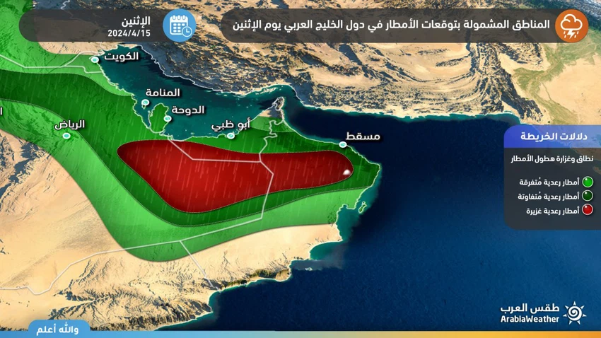 وتشير آخر تحليلات فريق التنبؤات الجوية في "مركز طقس العرب الإقليمي" إلى أن اشتداداً سيطرأ على الحالة الماطرة اعتباراً يوم الإثنين، بحيث تزداد قوة السحب تدريجياً وتهطل الأمطار في أغلب المناطق، على أن تشتد هذه الأمطار بشكل إضافي لتصبح غزيرة أحياناً ومُترافقة بالبرق والرعد وزخات من البَرَد ونشاط للرياح الهابطة، تشمل كافة مناطق البلاد بمافيها العاصمة ابوظبي والشريط الساحلي والأجزاء الداخلية وصولا حتى مدينة العين.