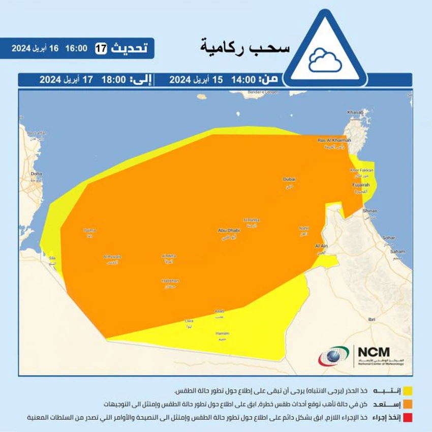 و قد أصدر المركز الوطني للأرصاد في الإمارات تنبيه (إستعداد) على مُعظم أنحاء الدولة للساعات المُقبلة.