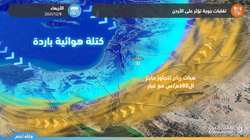 وفي التفاصيل فيُتوقع أن تتأثر المملكة يوم الأربعاء بامتداد لمنخفض جوي مصحوب بكتلة هوائية باردة تعمل على خفض درجات الحرارة لتصبح دون معدلاتها، كما ويُتوقع يُتوقع أن تدفع هذه المنظومة الجوية برياح جنوبية غربية نشطة مع هبات قوية أحياناً، قد تلامس بعض سرعاتها حاجز ال80كم/ساعة، ما سيعمل على إثارة الأتربة والغُبار بكثافة أحياناً، خاصة في المناطق الصحراوية وعلى الطرق الخارجية.