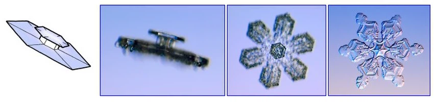 تنمو هذه البلورات أولاً لتصبح أعمدة قصيرة، ثم تنتقل لمنطقة أخرى في الغيوم حيث يصبح النمو شبيهًا بالصفائح، والنتيجة هي بلورتان رفيعتان تشبهان الصفائح تنموان على طرفي العمود الثلجي، وتوضح الصورة الأول الموجود على اليمين ثلاث جهات لبلورة ثلجية على شكل عمود مغلق، الصورة الأول في الأعلى هي لشكل البلورة من الجانب حيث العمود المركزي وحافة الصفيحتين، والصورتين في الأسفل لنفس البلورة من الأطراف حيث توجد الصفيحتان.