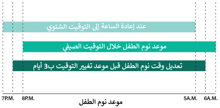 على سبيل المثال ، إذا كان طفلك ينام بشكل طبيعي من الساعة 8 مساءً حتى 6 صباحًا، فشجعه على النوم من الساعة 8:30 مساءً إلى 6:30 صباحًا لمدة ثلاثة أيام قبل تغير الوقت، ثم عد إلى الجدول القديم من الساعة 8 مساءً إلى 6 صباحًا في الوقت الجديد.