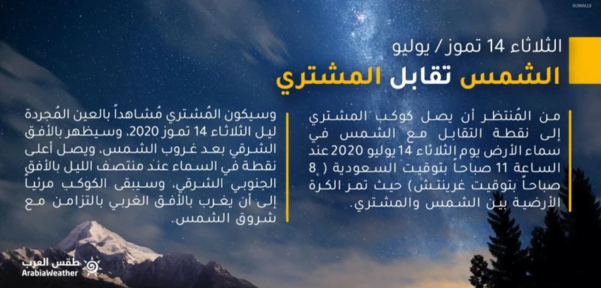 طقس العرب- يصل كوكب المشتري إلى التقابل مع الشمس في سماء الأرض يوم الثلاثاء 14 يوليو 2020 عند الساعة 8 صباحاً بتوقيت غرينتش ( 11 صباحًا بتوقيت السعودية) ، وخلال هذا الحدث الفللكي تمر الكرة الأرضية بين الشمس والمشتري.