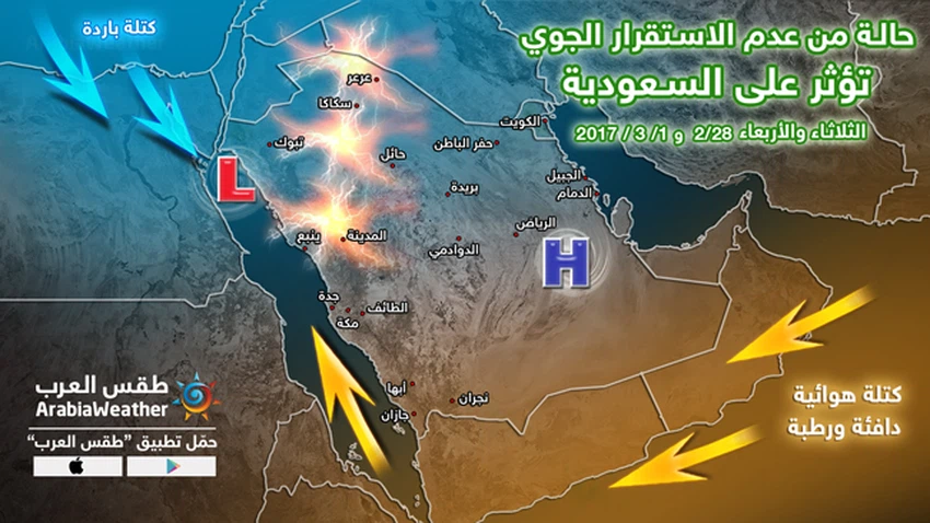 وتؤدي هذه الظروف الجوية الى نشوء منخفض جوي سطحي الى الشمال من حوض البحر الاحمر مما يدفع بانكسار التيارات الهوائية الدافئة والرطبة القادمة من الجنوب نحو الشمال الشرقي، وهذا من شأنه ان يؤدي الى نشوء احوال جوية غير مستقرة بمشية الله على تبوك والمدينة المنورة وينبع، اضافة الى المنطقة الشمالية حيث تكون الأمطار رعدية الطابع وغزيرة أحياناً بالاخص في المنطقة الشمالية تشمل القريات وعرعر وسكاكا، حيث يحتمل تشكل السيول في تلك المناطق.