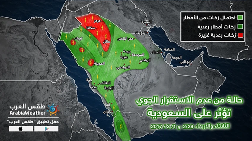 وتتهيأ الفرصة لهطول زخات رعدية من المطر متفاوتة الشدة، تشمل مناطق شمال البلاد. تمتد إلى أجزاء من المدينة المنورة، قد تكون غزيرة على فترات ومترافقة بزخات من البَرَد.