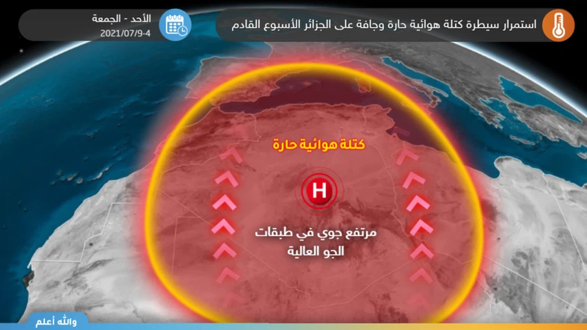 طقس العرب - يُتوقع أن يستمر تأثر جمهورية الجزائر بمرتفع جوي في طبقات الجو العالية، مرفقاً بكتلة هوائية حارة وجافة قادمة من الصحراء الافريقية، لتسود أجواء حارة ومرهقة وطويلة في عموم المناطق وسط مؤشرات على تراجعها بشكلٍ مؤقت نهاية الأسبوع.