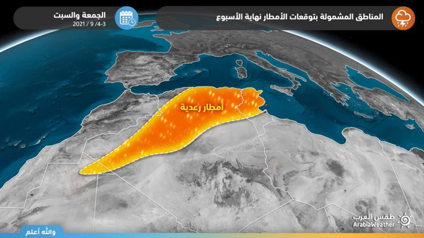 طقس العرب - تزداد المؤشرات لدينا في طقس العرب إلى تزايد تأثر القطاع الشمالي والغربي من الجزائر بأحوال جوية غير مُستقرة يومي الجُمعة والسبت، تترافق بعد مشيئة الله بالأمطار الرعدية الغزيرة وتساقط لزخات البرد، إضافة لوجود احتمالية عالية لتشكل السيول في بعض المناطق، وتالياً التفاصيل: