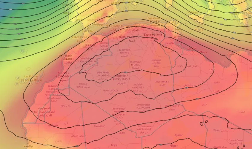 طقس العرب - من المنتظر أن يزداد تأثر عموم ولايات الجزائر خلال نهاية الأسبوع بالكتلة الحارة، بحيث توالي درجات الحرارة ارتفاعها، نتيجة استمرار سيطرة مرتفع جوي قوي وعنيد في طبقات الجو كافة فوق المنطقة، لتسود أجواء حارة ومرهقة وطويلة في عموم المناطق، لتدخل بذلك الجمهورية في ذروة تأثير الكتلة الحارة.
