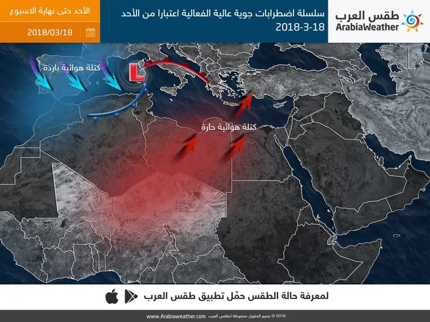 هذا ويتابع طقس العرب احتمال استمرار الأجواء المضطربة والمنخفضات الجوية الاسبوع المقبل.