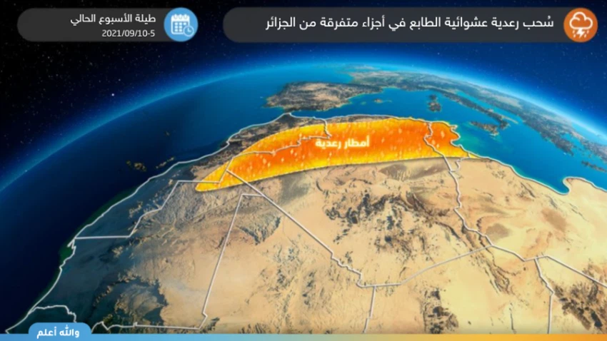 طقس العرب - توقع كادر التنيؤآت الجوية في طقس العرب استمرار تأثر الأجزاء الداخلية من شمال الجزائر بمشيئة الله بأحوال جوية غير مُستقرة بشكلٍ يومي طيلة الأسبوع الحالي، تتكاثر على إثرها السحب الركامية لتشمل أجزاء واسعة من البلاد، وهذه تفاصيلها: