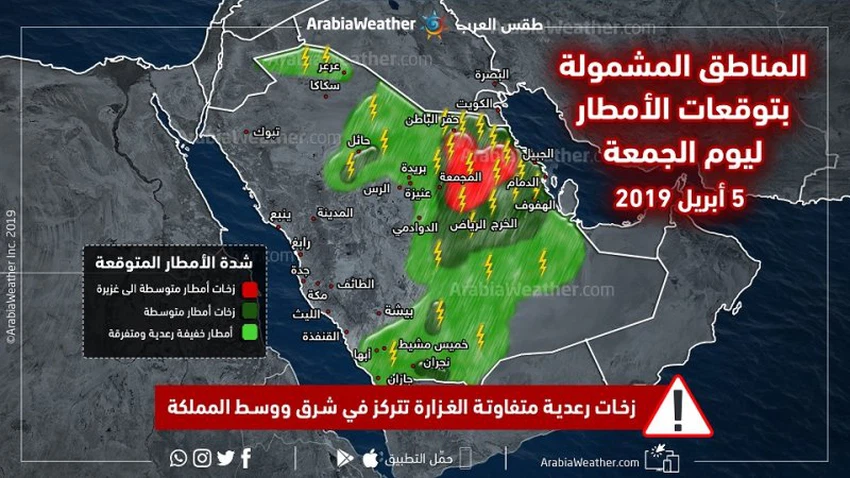 نهار الجُمعة بمشيئة الله تزداد كثافة السحب الرعدية الماطرة، وتتركز في الأجزاء الشرقية من جنوب غرب المملكة ونجران وأجزاء واسعة من جنوب وشرق وشمال شرق المملكة بما فيها منطقة الرياض والعاصمة نفسها، القصيم ووسط وشرق حائل والشرقية وحفر الباطن وبشكل ضعيف الحدود الشمالية.
