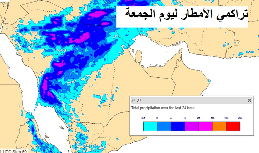 وتظهر الخريطة المرفقة التالية مجموع كميات الأمطار المتوقعة وذلك بالاعتماد على المركز الأوروبي خلال يوم الجمعة،