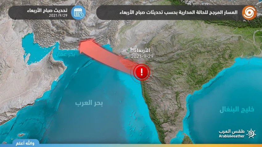 طقس العرب - تُشير آخر صور الأقمار الاصطناعية ومراصد الاستشعار عن بعد في مركز طقس العرب الإقليمي للتنبؤات الجوية، إلى تمركز الحالة المدارية جلاب فوق خليج كوجرات وبدأت تستعيد قوتها من جديد بسرعة رياح تبلغ 25 عُقدة حول مركز المنخفض المداري، ويرى طقس العرب بأنها ستواصل مسيرها نحو الشمال الغربي بمحاذاة السواحل الباكستانية خلال اليومين القادمين، وتالياً التفاصيل: