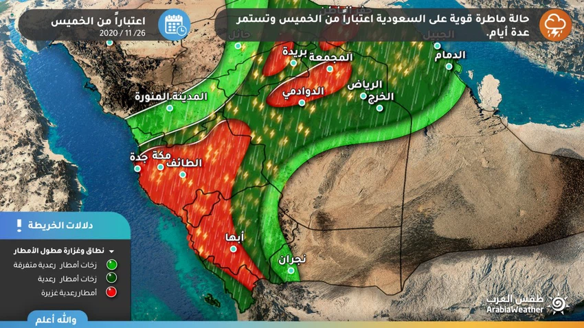 وتصنف الحالة المتوقعة بأنها من الحالات القوية خاصة وأنها ستترافق بهطولات مطرية غزيرة ووافرة في بعض النطاقات خاصة في القطاع الغربي والأوسط من المملكة، مما يزيد احتمالية تشكل السيول وارتفاع منسوب المياه في الشوارع.
