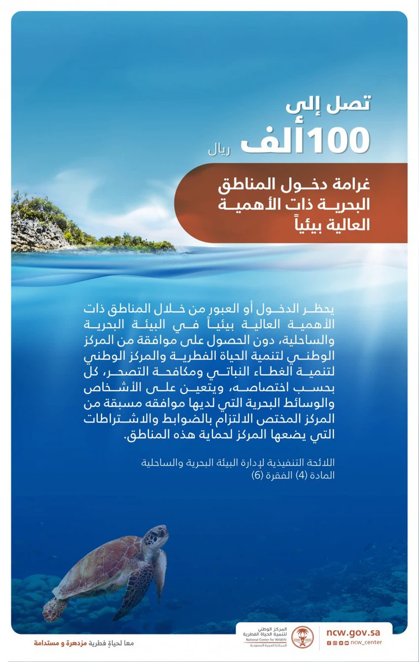 أعلن المركز الوطني لتنمية الحياة الفطرية أن مخالفة الدخول للمناطق البحرية ذات الأهمية العالية بيئيًا تُقدّر حسب مدى تأثير المخالفة على النظام البيئي والكائنات التي تعيش فيه.